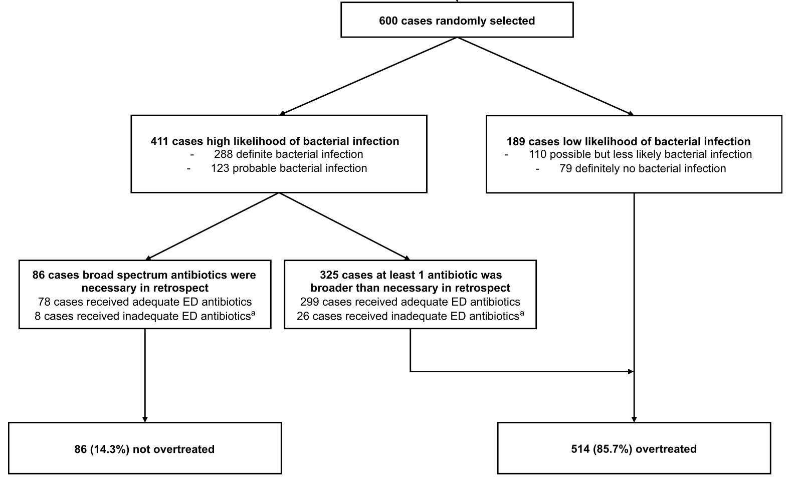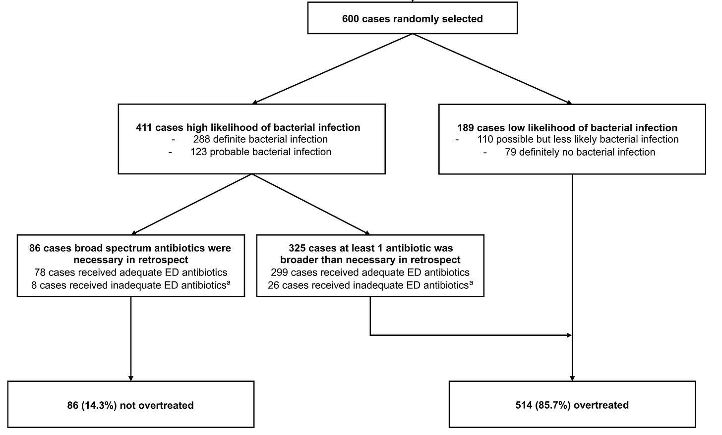 As you can see, a preponderance had definite or probable bacterial infection at the time of treatment – but that still left >30% of cases adjudicated to have low or zero likelihood of infectious disease. The net result: 5 in 6 patients in the ED received overly-broad antibiotic coverage.
