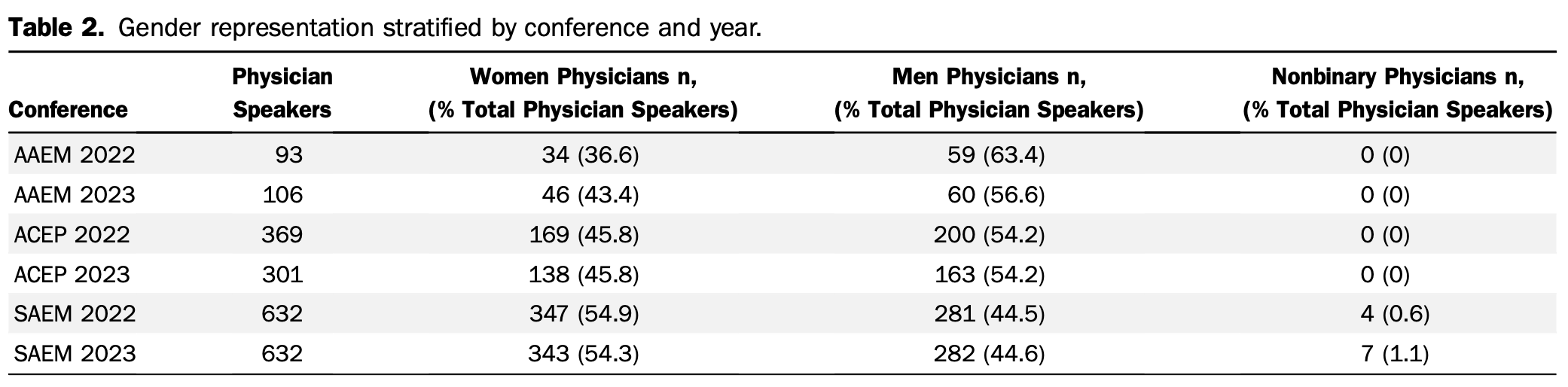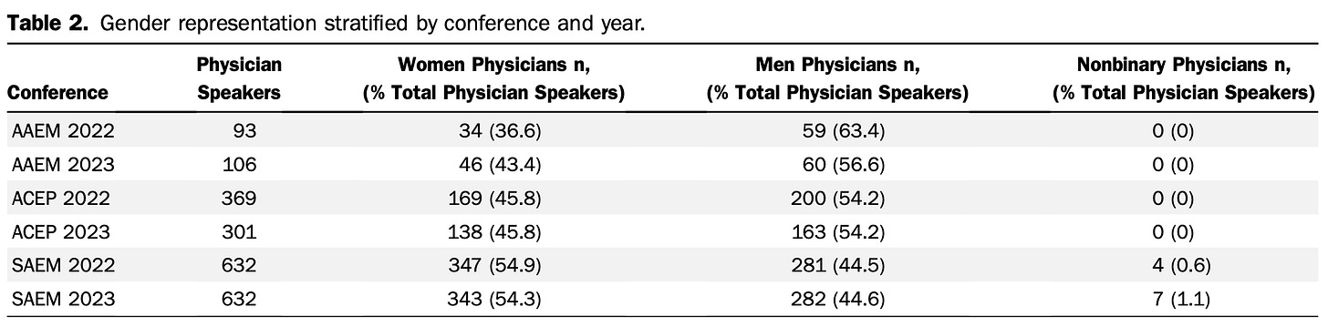 This is just a very brief research report from Annals of Emergency Medicine with a simple look at reported gender from speakers at emergency medicine conferences the past couple years.