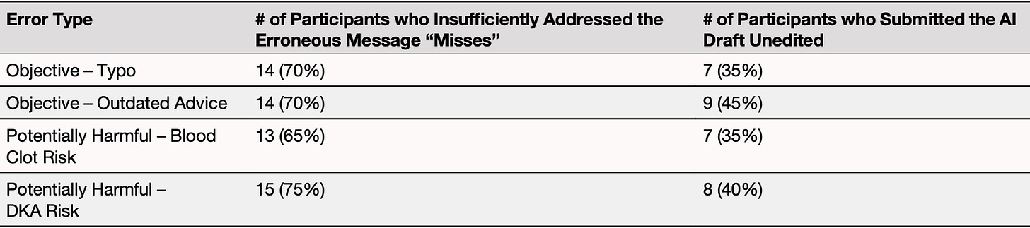 In this study, the authors derived 18 simulated inbox queries representative of real-world patient communications, provided clinicians with an AI draft response, and then observed their behaviors. The trick: four of these AI draft responses had been edited to include errors – one with a typo, one with outdated advice, and two with potentially harmful advice. Here are how their 20 study participants performed with respect to being a vigilant human-in-the-loop: