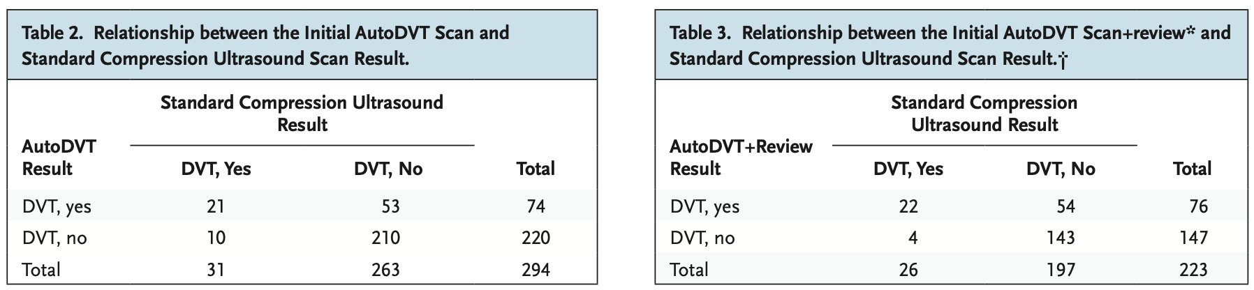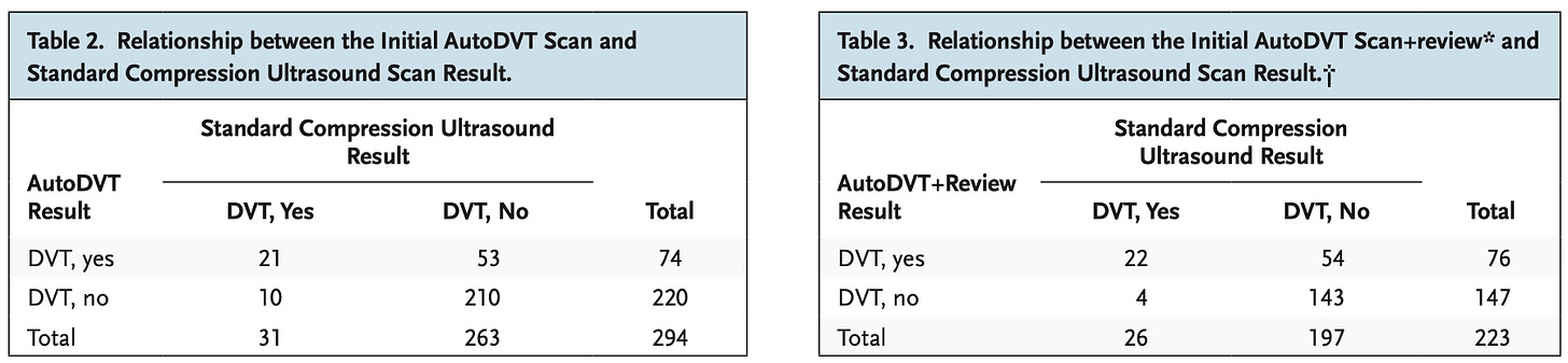It’s a simple application of AI image processing to guide evaluation for deep venous thrombosis using a two-site compression technique augmented by machine learning. In this trial comparing “AutoDVT” to sonographer gold standard, the authors analyzed 294 patients in a couple different ways, and these two tables convey the bulk of the findings: