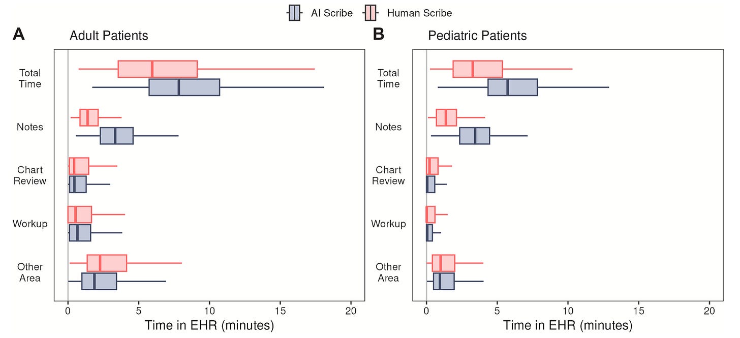 Physicians working with a human scribe spent less time in the EHR – particularly within the notes of the EHR – than those working with the ambient scribe. Note quality, as rated by the PDQI-9 framework was similar, though physicians added a greater number of characters to the ambient scribe notes to bring them up to that standard.