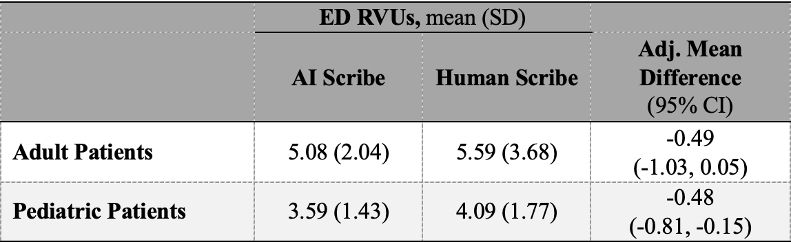 Of further concern, at least for our U.S. friends, encounters featuring ambient scribe use garnered fewer RVUs, on average, than the human scribe: