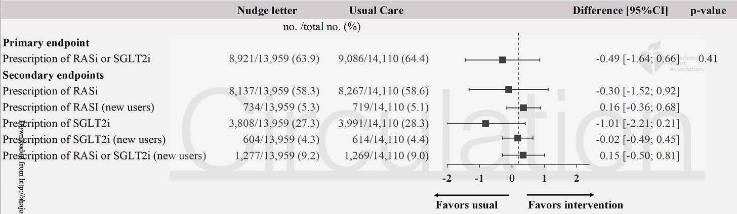 Clearly, this is not even close to satisfying the 5 Rights of CDS (the right information, to the right person, in the right format, through the right channel, at the right time), so it’s clear how it was doomed from the start. There are some exploratory endpoints where patients were slightly better informed about their health, but this did not manifest in any objectively measured endpoint.