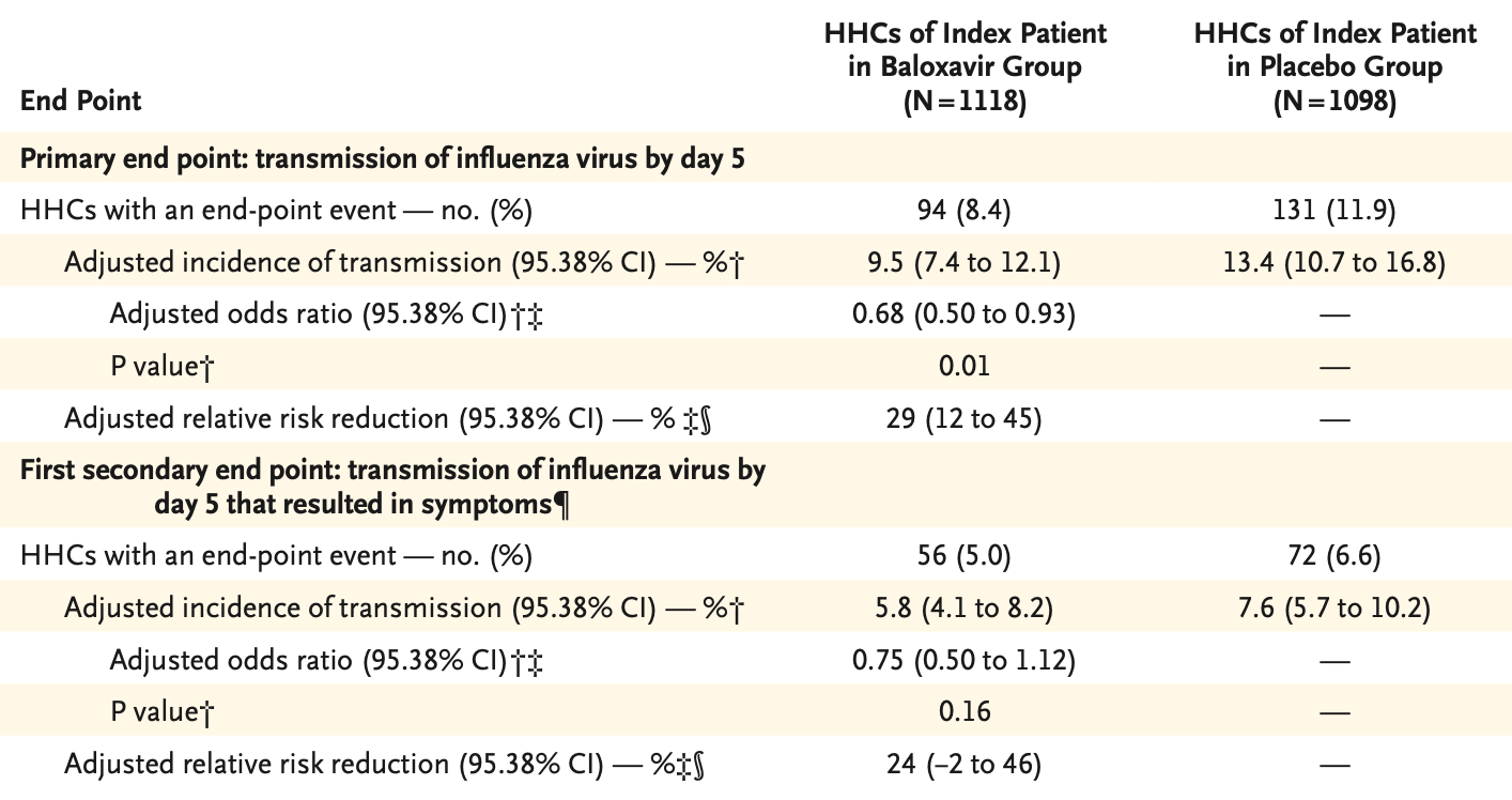This is CENTERSTONE, the “let’s give baloxavir to folks and see if it prevents onward transmission to household contacts” trial – and the answer is: kind of?