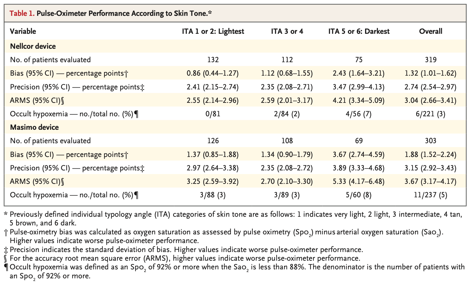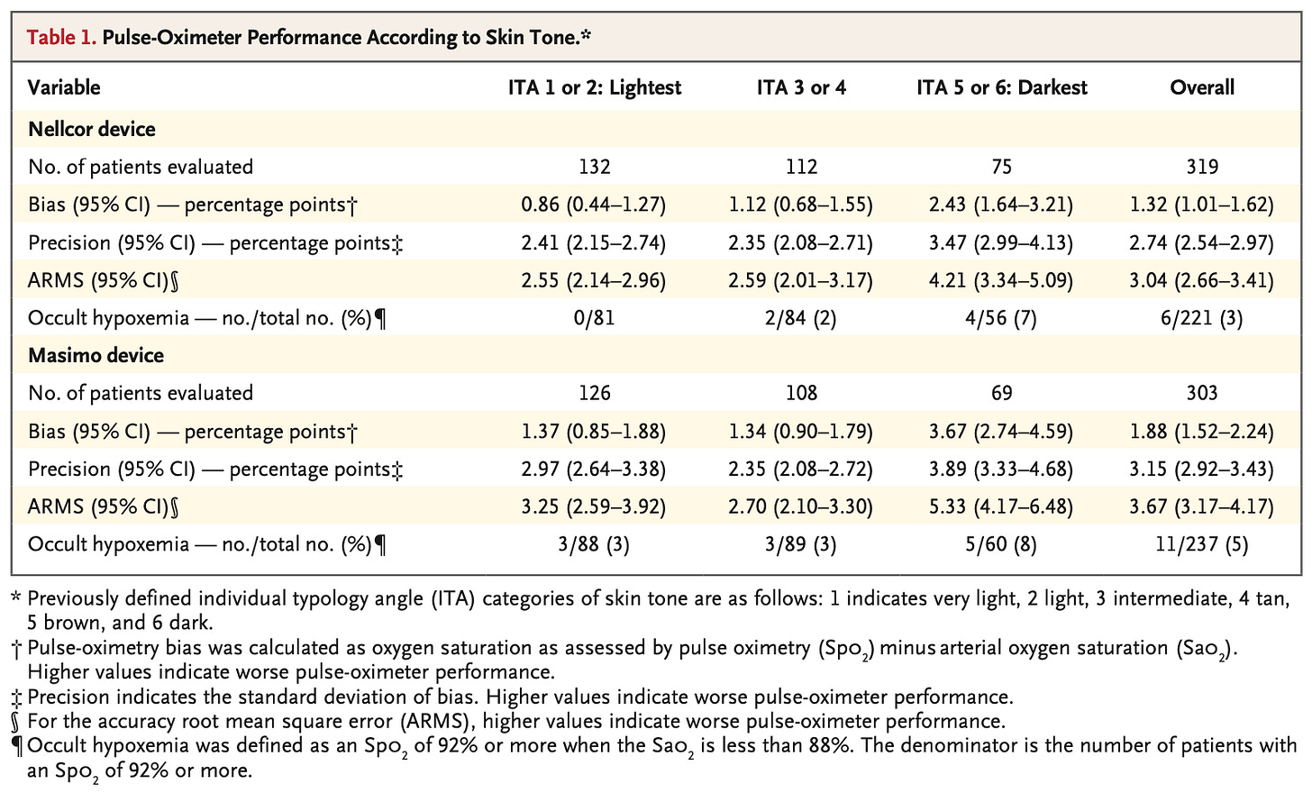 A few years ago prominent attention was brought to the fact pulse oximetry readings obtained by typical peripheral monitoring devices provided biased results due to the pigment content of skin. The basic finding – paired peripheral oxygenation and arterial oxygenation measurements were only unbiased in light-pigmented skin, whereas arterial oxygen measurements were, in actuality, lower in those with dark-pigmented skin.