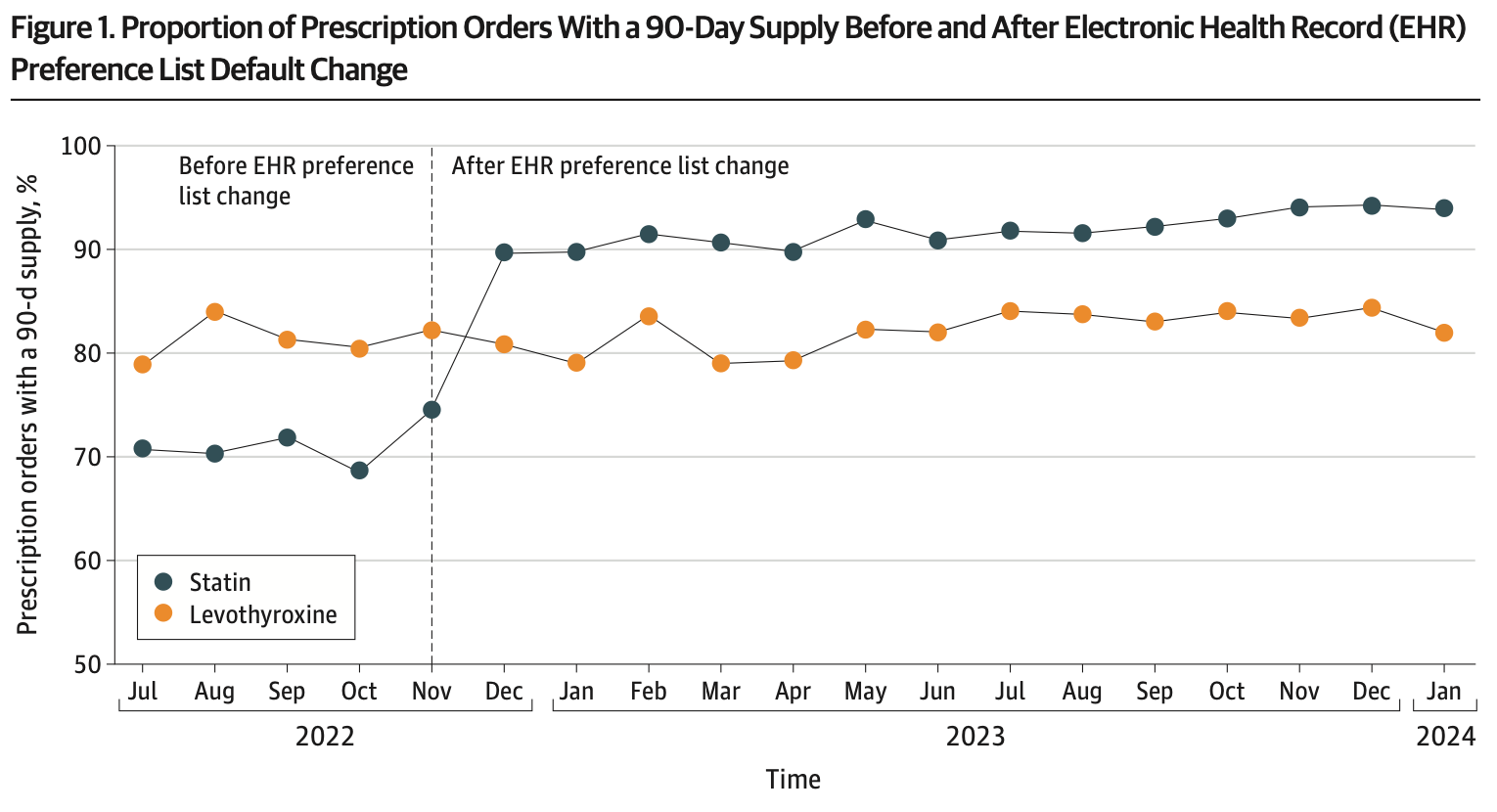 Now, did increasing the frequency of 90-day supply directly translate into improved medication-days, and subsequent patient-oriented outcomes? That’s the hope, but obviously beyond the scope of this study. Regardless, simple, passive changes to defaults, checked options in order sets, or to the order sets themselves can have outsized influence.