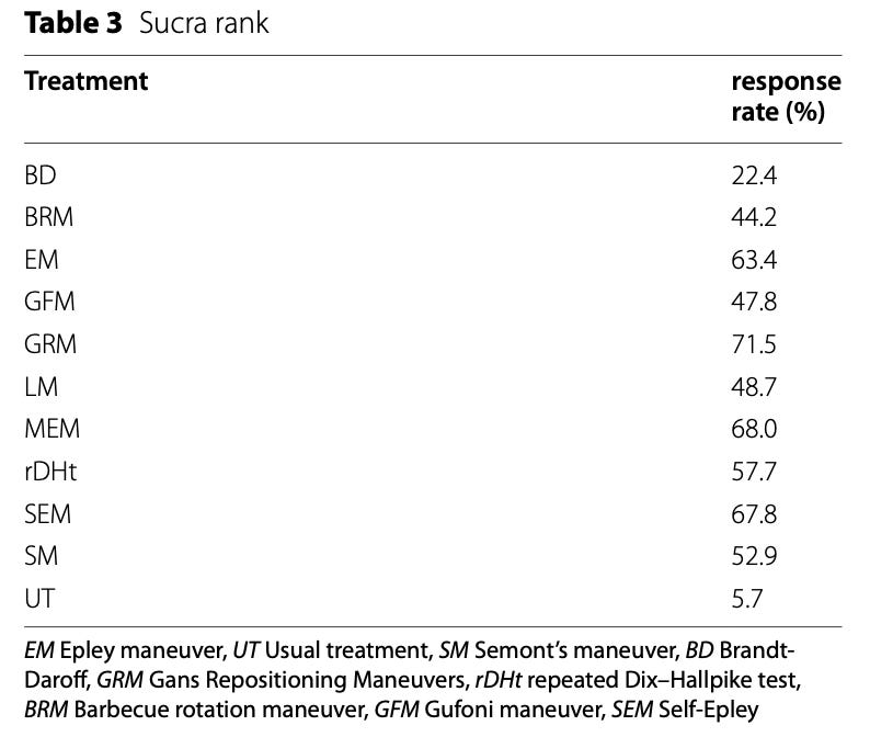 As you can see, nearly everything is substantially better than "usual treatment” – no surprise there. However, very little data exists for most of these maneuvers, with Epley dominating the evidence base. Some of the other ones may have specific advantages in patients unable to perform the Epley, but it would seem you can’t go wrong with the classic.