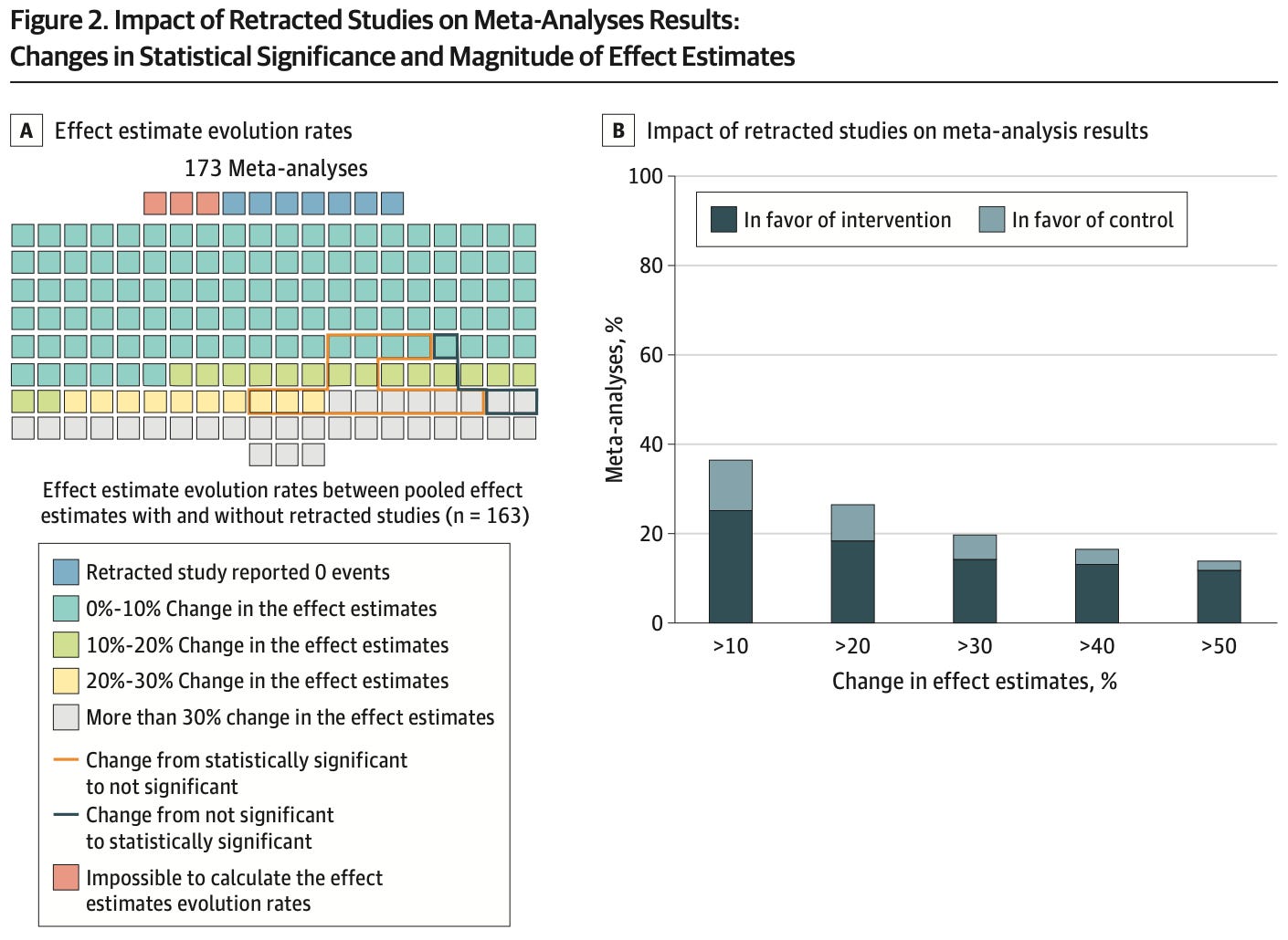 These authors traced retracted studies to the 25 highest Impact Factor journals to determine whether they had already been swept up alongside valid published evidence for inclusion in systematic reviews and meta-analyses. A handful of these systematic reviews had been republished, retracted, or withdrawn themselves, but the vast majority (82%) lived on. Out of these, the authors were able to recalculate the outcomes from meta-analyses in 166, with the following effects: