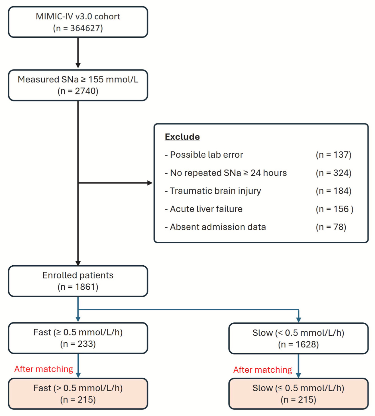 The study in question tests the legend of slow vs. fast correction for patients with severe hypernatremia, distilling down the MIMIC-IV 3.0 cohort for a propensity-matched comparison: