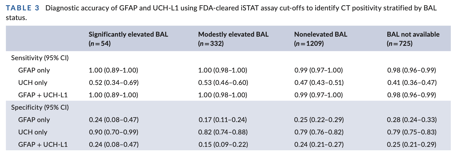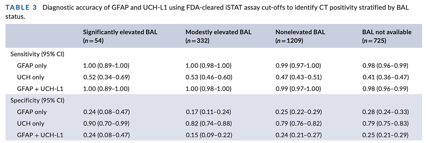 Not too shabby – but, such small numbers the confidence intervals are quite wide “significantly elevated BAL”. Then, what is the acceptable miss rate for an intracranial injury, after all? Is it ~1%? A debatable point, but within the realm of consideration. And, I think that’s the point of these sponsored authors pushing these data out in a new publication.