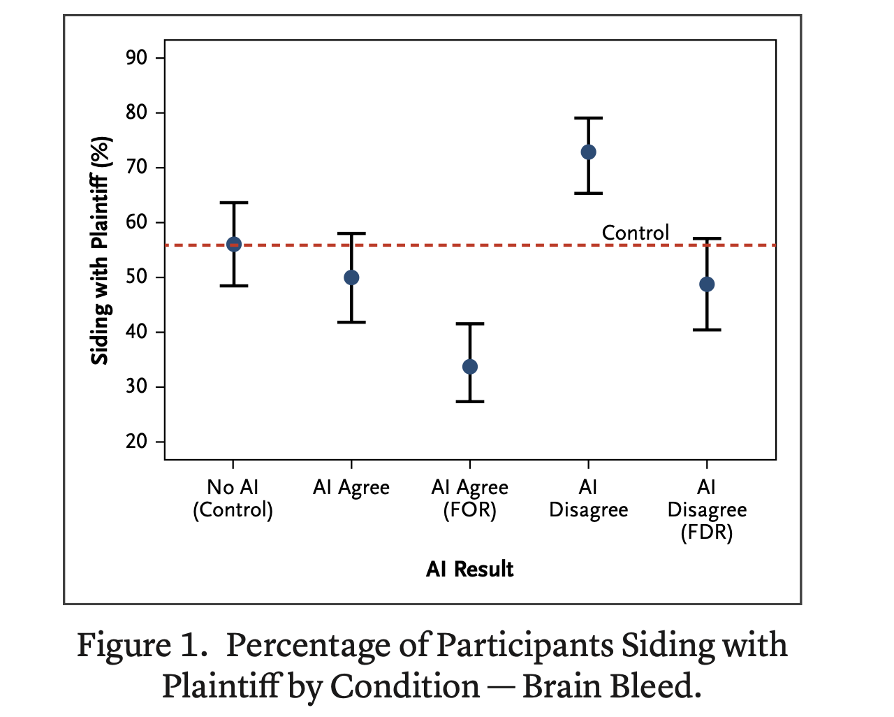 There were about 650 participants recruited from the general public, and they were given two scenarios – a radiologist who missed a brain bleed, and a radiologist who missed cancer. Within each scenario, participants were randomized to the radiologist having no AI involved, or one of four AI augmentation interactions: