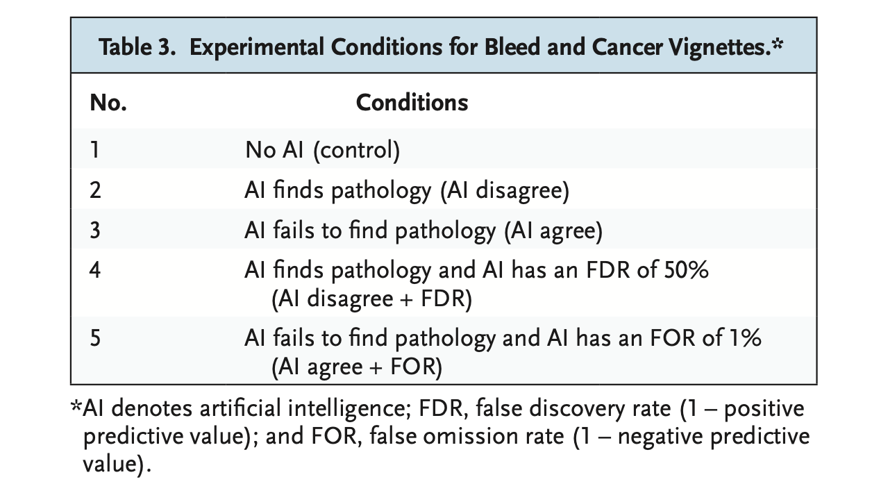Effectively, sometimes the AI missed it along with the radiologist, and sometimes the AI caught it – and in two scenarios, information regarding the performance characteristics of the AI was provided, as well.