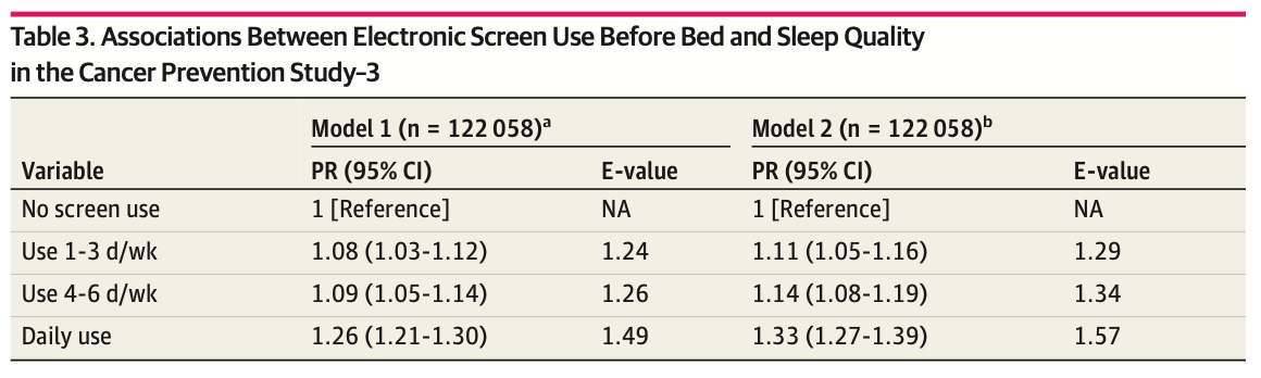 Now, this is all self-reported survey data, and an association is not causation; confounding factors could be contributing to both increased screen use and poorer sleep, rather than the entire effect size being attributable to the screen use itself. Then, television electronic screens were specifically excluded from being a contributing factor, despite likely similarly disruptive levels of blue light or prolonged wakefulness.