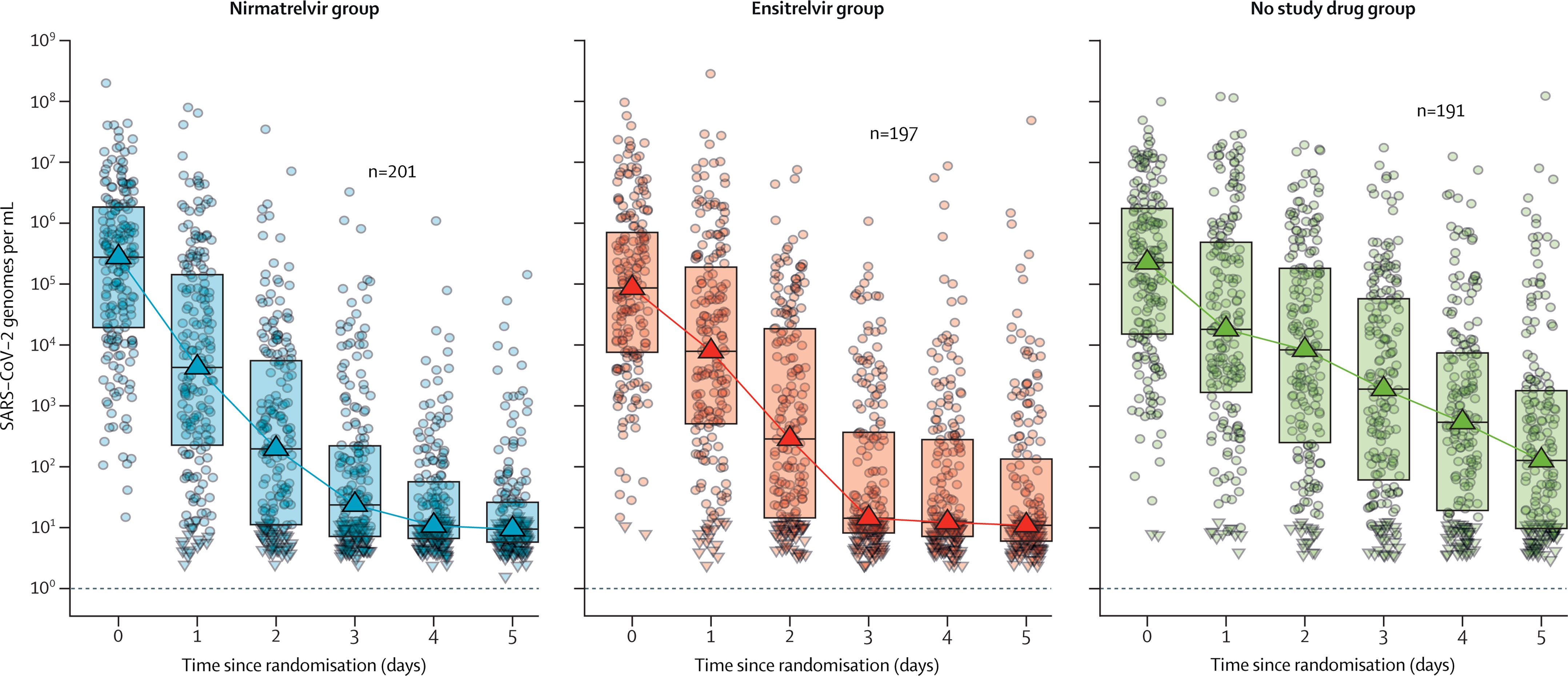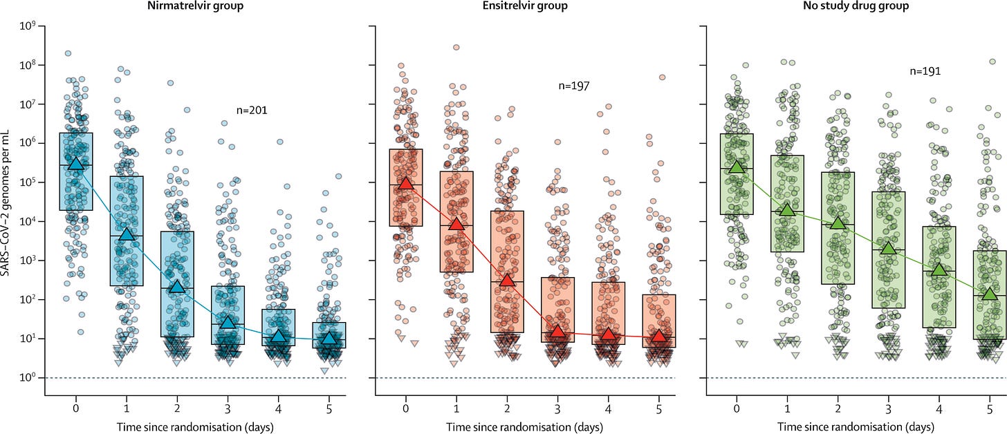 Enter ensitrelvir: it’s like nirmatrelvir. In fact, it’s so much like nimatrelvir it targets the same protease. And, when put up against nirmatrelvir, it clears viral particles from the nasopharynx in roughly the same timeframe:
