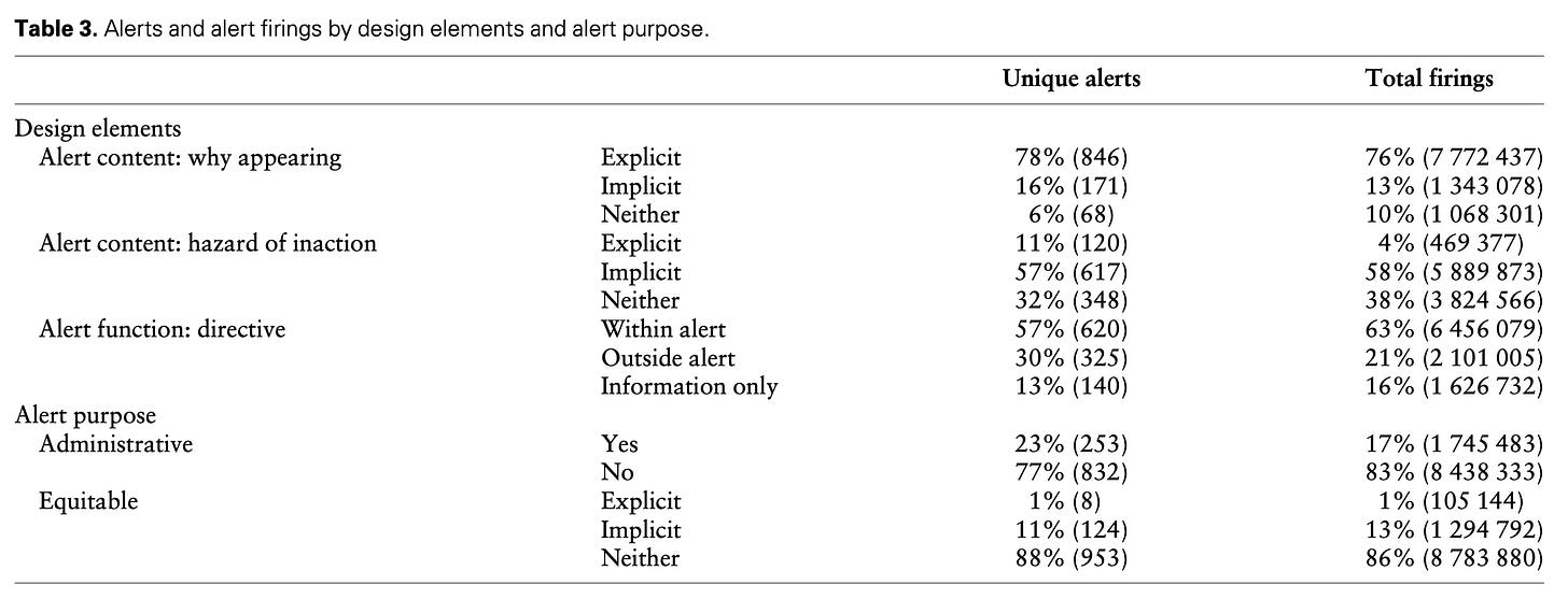 I don’t think there’s much sugar-coating this when the best-scoring qualitative design measure still had 1 in 4 alerts failing to clearly identify its function. Only mere handfuls of alerts explicitly described the hazards of inaction. A bare majority allowed users to take the appropriate clinical action from within the alert. Not only that, nearly 1 in 5 alerts was purely of an administrative purpose, and not for patient care.