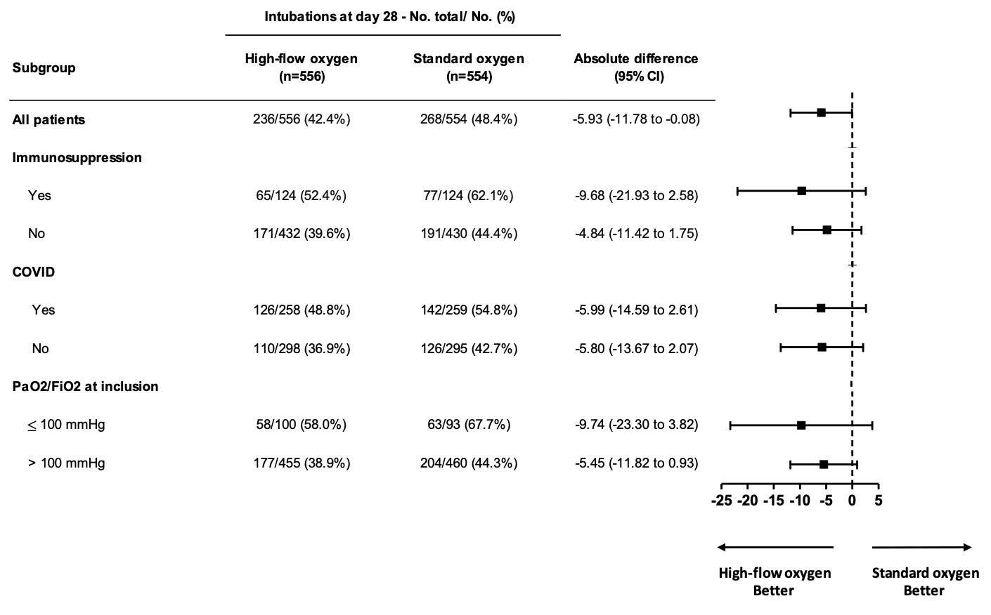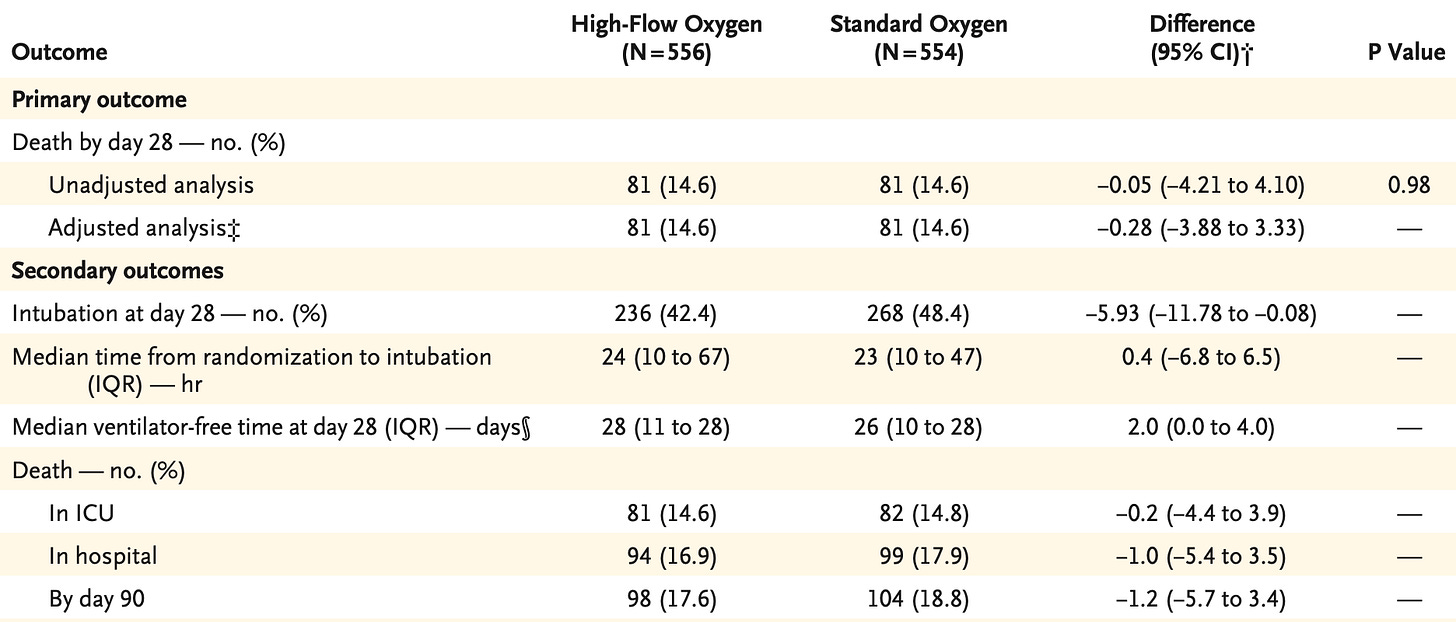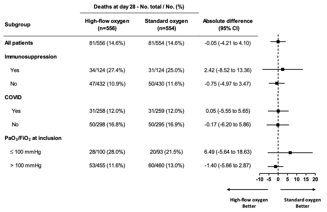 It’s a bit challenging to interpret these data primarily due to the non-blinded nature of the intervention. That is to say, the presence of HNFO on a patient is likely to push clinicians to delay intubation – and it’s unclear the downstream effect on patient-oriented outcomes. There is probably some clue behind this in the subgroup analyses in the supplement: