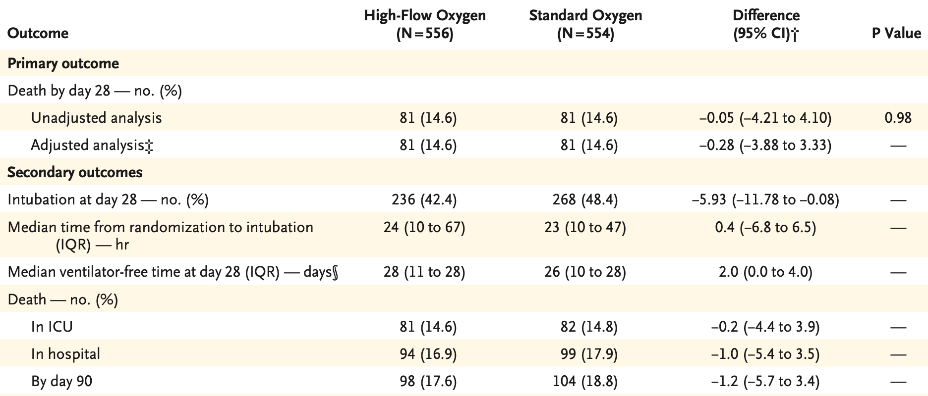 The primary patient-oriented outcome is not different. This is similar to the lack of difference identified by this same research group in their COVID-only cohort, SOHO-COVID – and not terribly surprising because about half of this cohort is also COVID-19-associated respiratory failure.