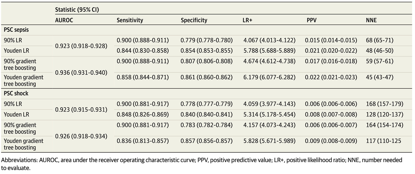 In this study, the PECARN family gets together to try and use machine learning methods to detect which children presenting to the emergency department will go on to develop PSC-defined sepsis and septic shock. With 1.6M visits to train (0.35% sepsis, 0.15% septic shock) and 700k held out to test, these data scientists were able to develop a model with AUROC of 0.936. This sounds OK until the rubber hits the road choosing a threshold for clinical implementation – specificities of ~0.8 when mandating a sensitivity of 0.9: