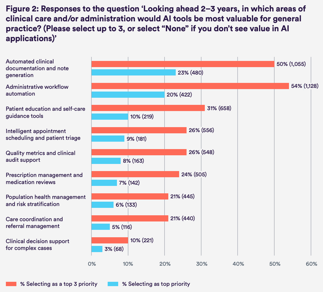 Interesting to see how few ranked direct clinical augmentation (see: complex decision support at #10) versus offloading other time-consuming, burdensome tasks. The pain points for primary care come very clearly to the surface, here.