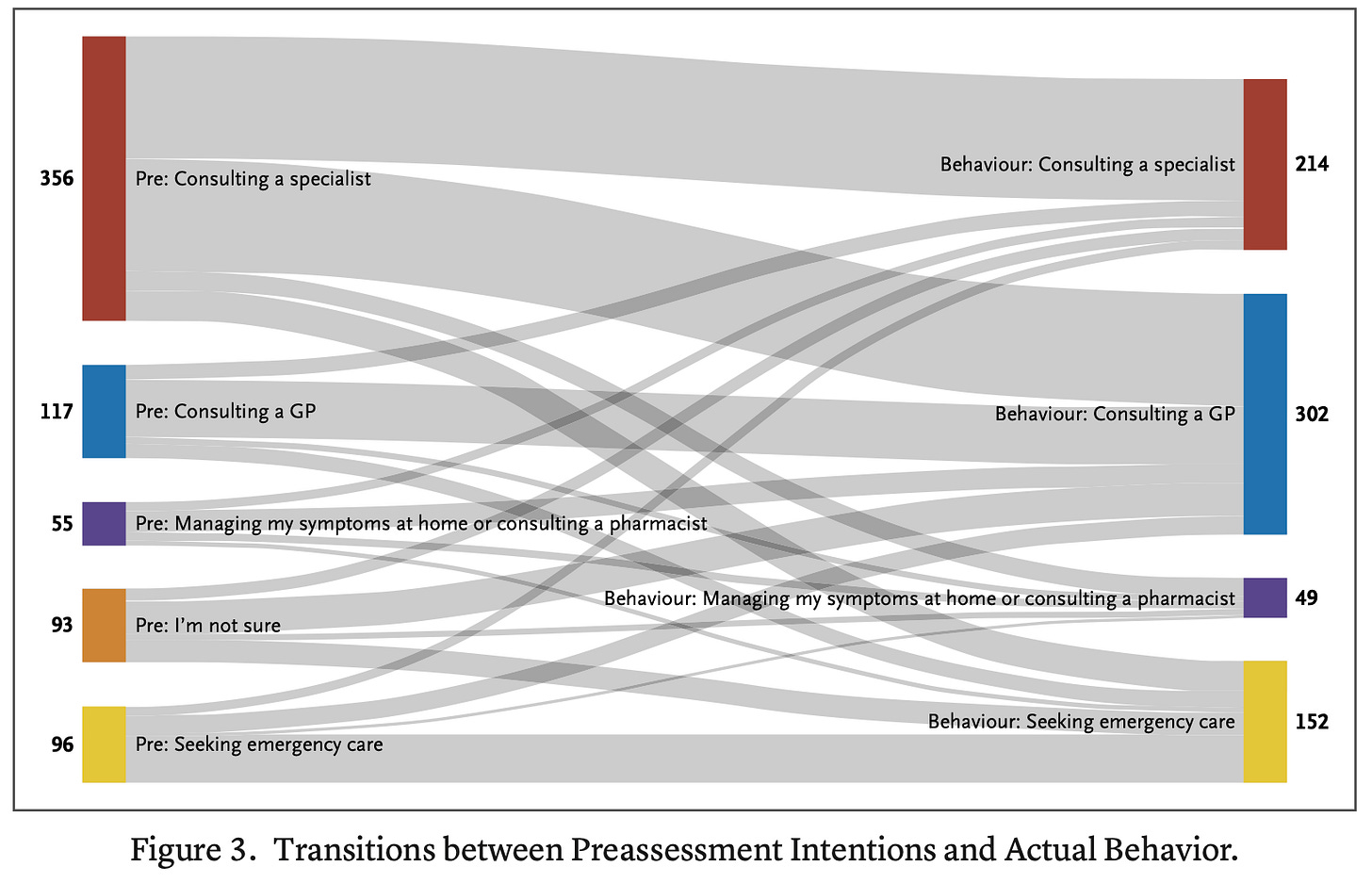 Whether these have either internal or external validity is highly suspect. The authors prompted 33,000 to take part in these surveys of pre-Ada Health intention and captured a mere self-selected 1,400 – half of which they lost to follow-up, leaving the 700-odd shown in the Sankey diagram above. Then, much depends on the healthcare environment wrapping around the entrants into a platform such as this – meaning the generalizability will be limited by the resemblance of your patient population to those belonging to this private healthcare organization, and the resources the organization has to offer. Finally, it’s Ada Health reporting on Ada Health, which always raises questions regarding things Left Unsaid (née Unreported).