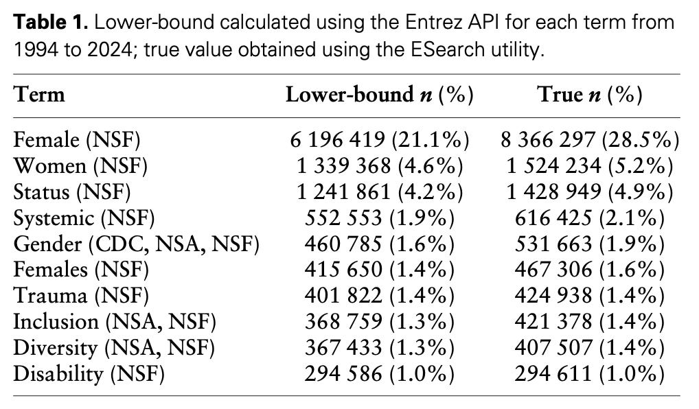 While there’s no question the ideological purge of the biomedical sciences is horrifying, I don’t think this estimate should be conflated to represent the true scope of potential censorship. The terms “female” and “women” represent the vast majority of the “problematic” search terms, and it is unlikely all of these articles would be whitewashed as ideologically inappropriate.