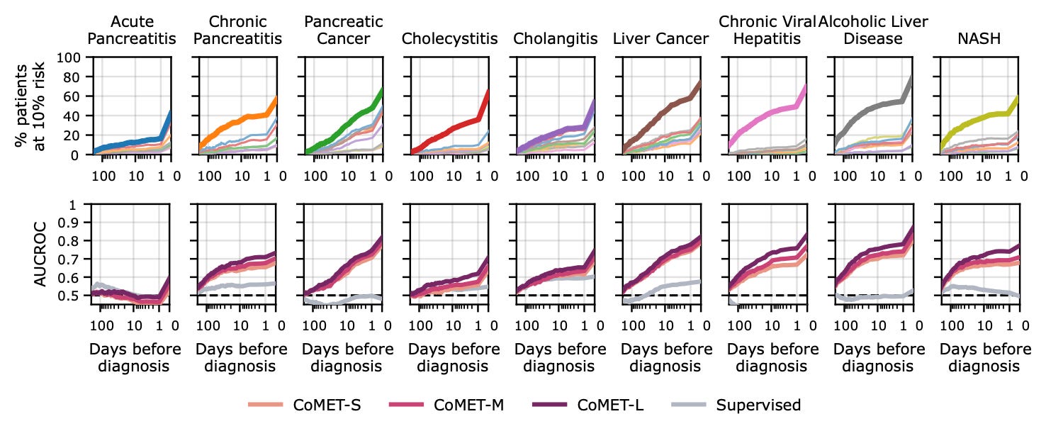 Further interesting is the bit under the hood where they look at comparison between these “general” prediction models and task-specific, supervised, machine-learning models. The authors tested both a 119M parameter supervised CoMET and an XGBoost decision tree classifier, and ultimately compared their CoMET to the XGBoost versions. The predictive ability of CoMET was mostly better than the XGBoost models, although it is not yet well-described where, or whether, the performance is sufficient to be clinically useful: