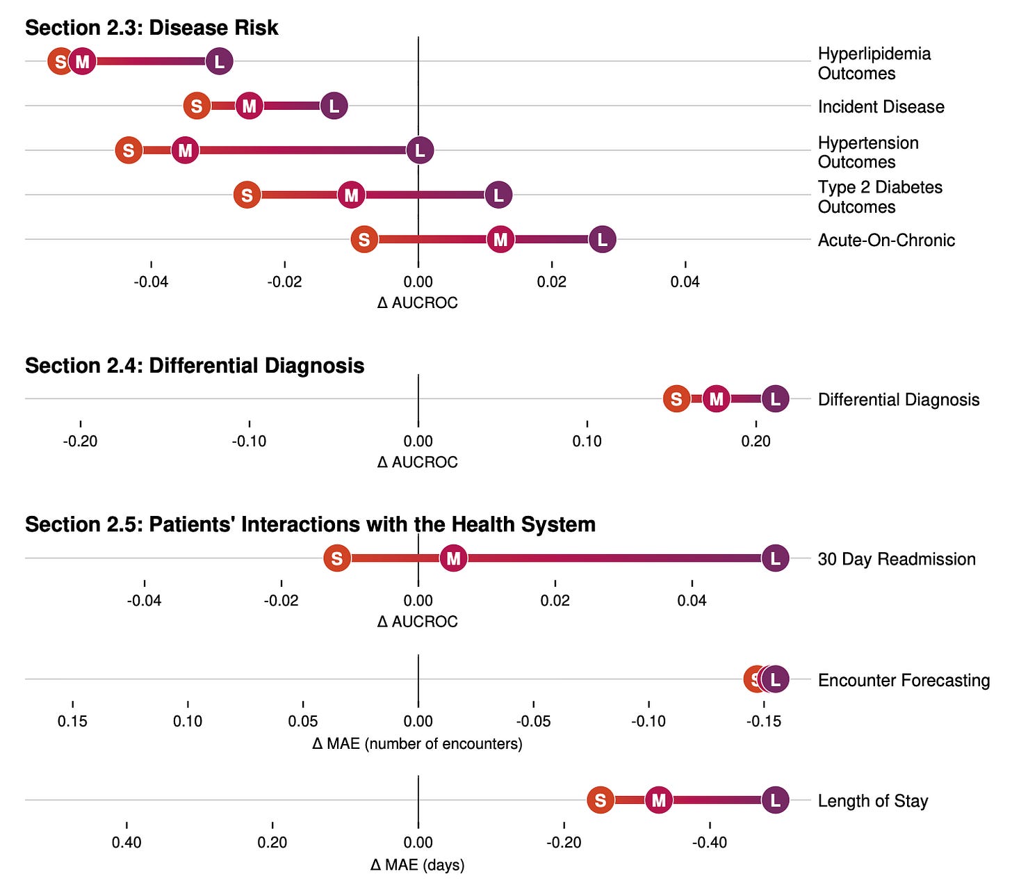 Most of the news coverage will likely discuss the clinical implications of these prediction engines, but the article is also here to tell us: bigger is better, as far as transformer goes. The comparison features CoMET-S with 62M parameters vs. CoMET-M with 119M parameters vs. CoMET-L with 1B parameters. Larger is better for most, although the relevance of the differences is variable and task-specific: