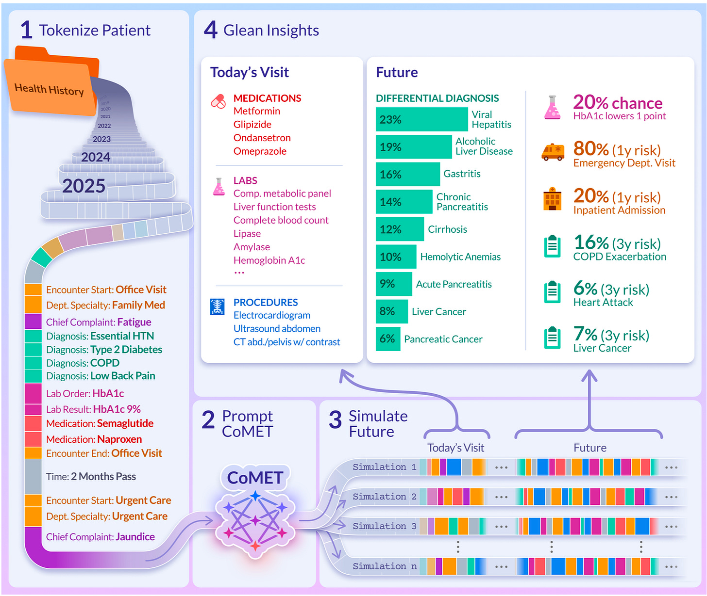 The paper they’ve published is only obliquely about the clinical plan for Cosmos AI, and focused moreso on comparing the performance of the CoMET transformer models of varying size. However, the overall gist of the vision can be gleaned from this glossy information graphic: