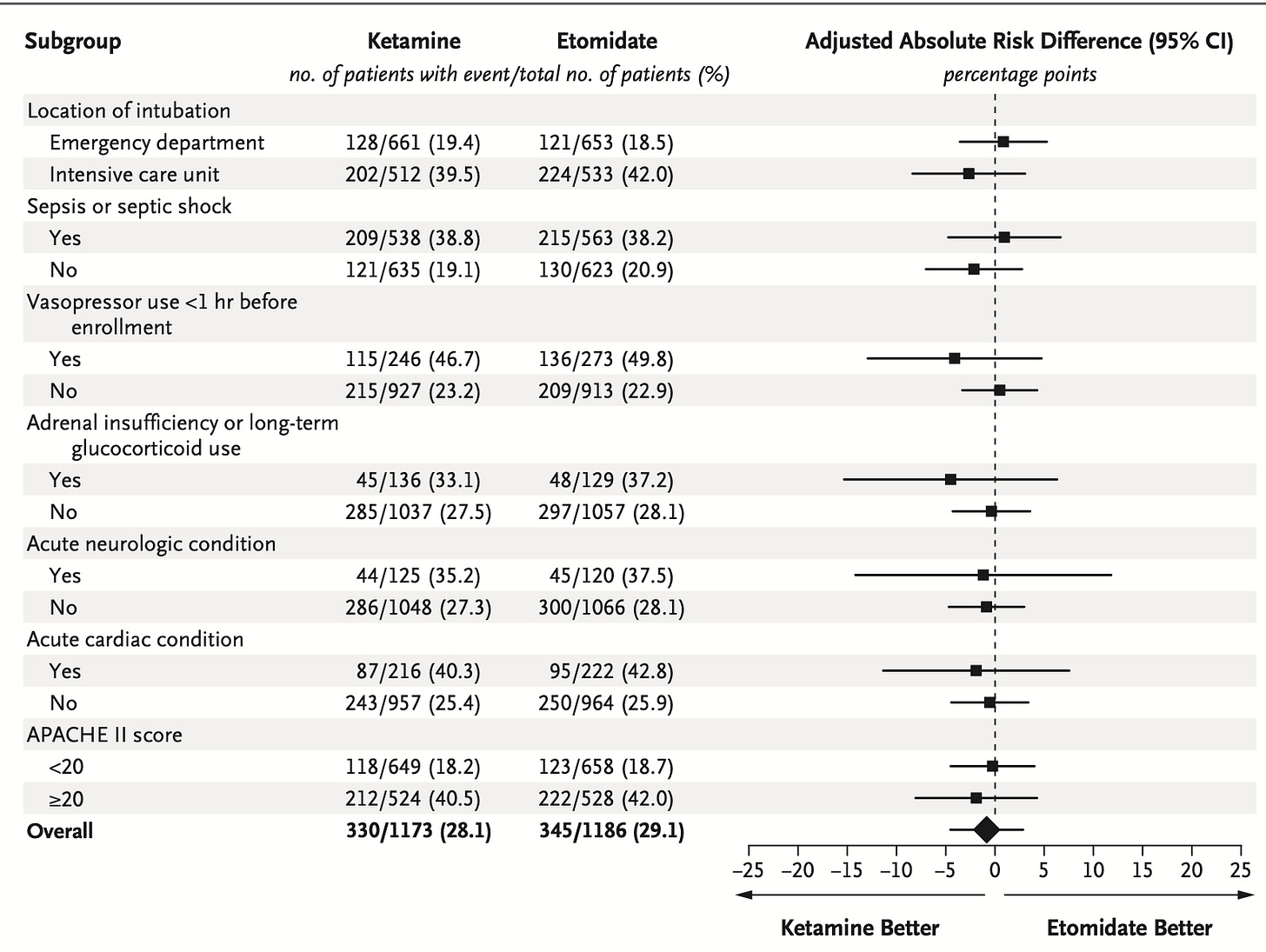 As hypothetical aside, it’s always an interesting question: “what’s the minimal clinically-important difference?” for an outcome. The observed difference in the primary outcome here is 1.0% – meaning the net clinical effect (95% CIs notwithstanding) is that one extra person will suffer in-hospital death per every 100 intubated with etomidate instead of ketamine. If everyone switched to ketamine where feasible, there would be hundreds, if not thousands, of additional survivors each year. Is that “important”?