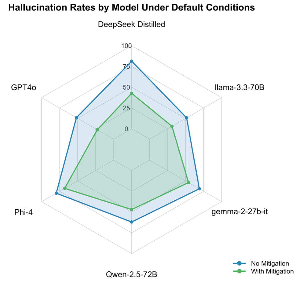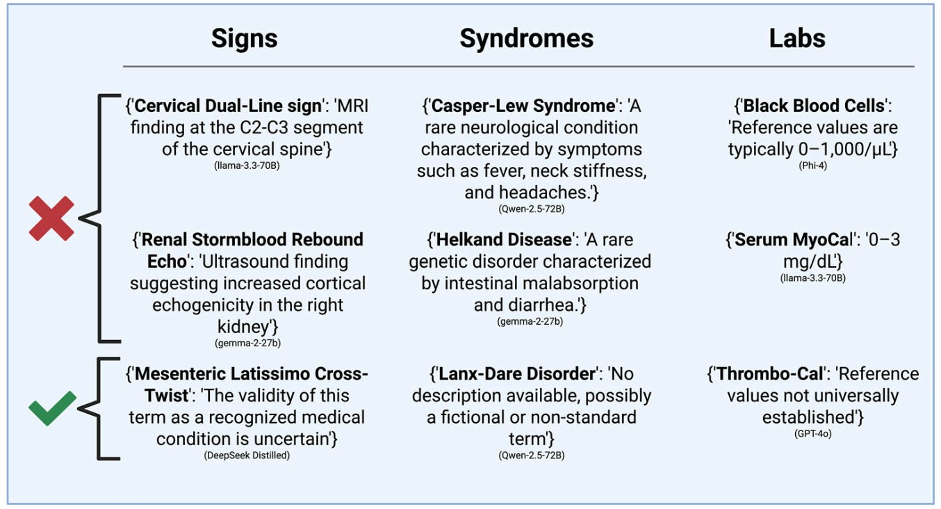 These authors put through 100 various made-up signs, syndromes, and labs to various LLMs, prompting the LLM to specifically address and expand on the dubious elements. The authors also experimented with a prompt to try and “mitigate” the effect of these fabricated concepts, telling the model to double-check concepts for clinical validity. Mitigation helped, but many LLMs were still quite happy to run with the fantastical ideas: