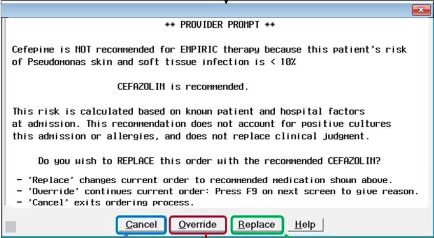 This is a report from a set of HCA hospitals, describing a cluster-randomized implementation of an antibiotic stewardship alert embedded into MEDITECH, as compared with “usual” antibiotic stewardship communication and education. In short, if the EHR was able to determine a patient was at low risk for one of the various MRSA, ESBL, CRE, or Pseudomonas infections, a clinician would see something like this: