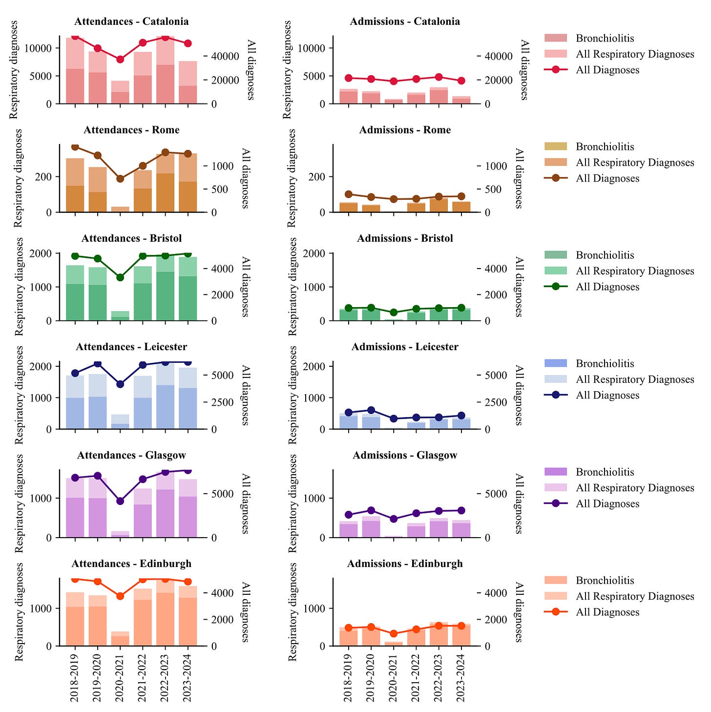 However, there is one outlier – Catalonia, the region where nirsevimab demonstrated wide uptake among newborns and infants aged less than 6 months of age. Rather than remaining steady, along with the rest of the sampled healthcare systems, Catalonia dips down profoundly with respect to bronchiolitis visits and admissions. These dips are primarily the consequence of a halved risk for admission in young infants, those at highest risk for the poorest outcomes.