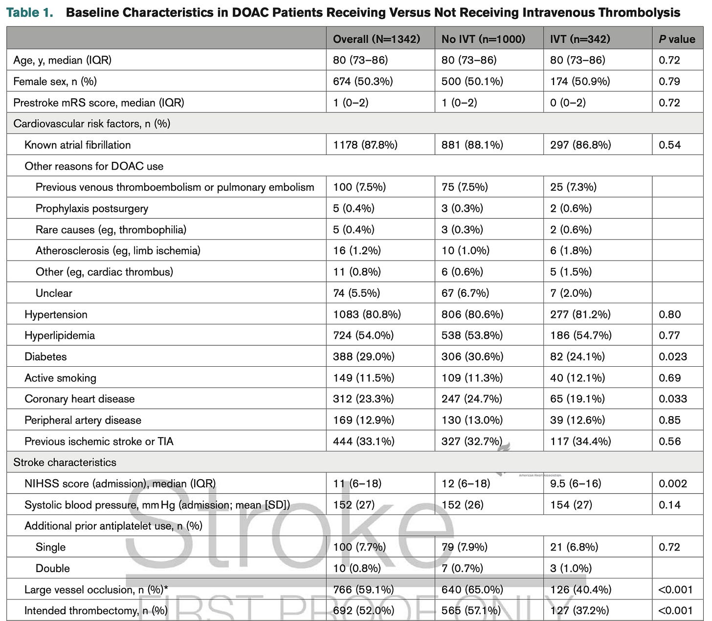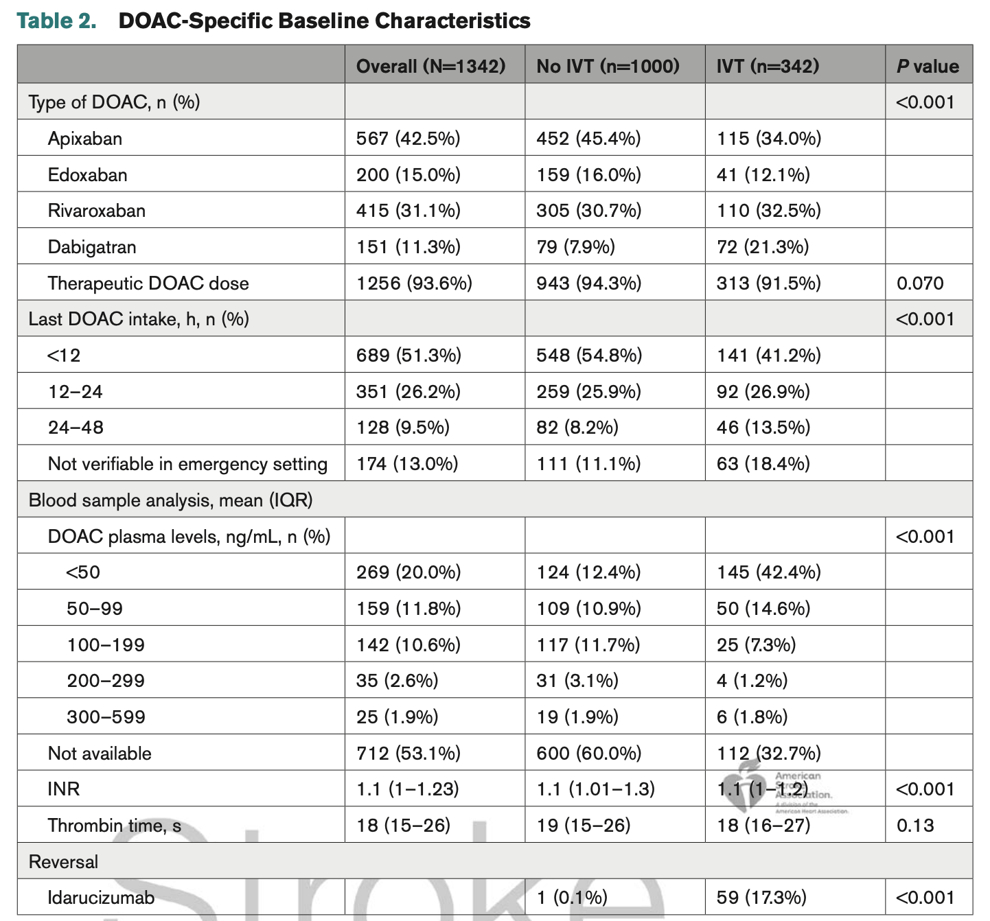 This trial attempts to do the TTE thing for IVT in patients taking DOACs using ongoing stroke registries from 28 stroke centers and 1 national registry. In theory, to for a TTE to maintain the integrity akin to randomization from an RCT, patients meeting the defined inclusion criteria at time zero ought to be reasonably well-balanced. This would indicate clinicians were looking at these patients and making, based on true equipoise, an essentially random sort of eligible patients into different treatments.