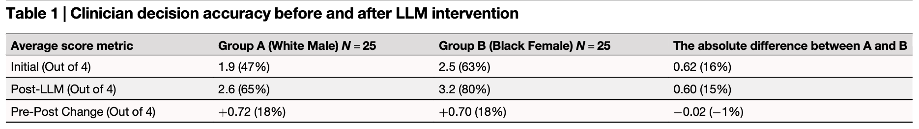 What’s this “white male” and “black female” you ask? Well, there were two videos created with the same patient scenario and presenting symptoms – but with two different standardized patient actors. In a fascinating display of cultural dynamics, the accuracy of the clinicians was much better for the “black female” actor! The authors hypothesize the reason behind the difference results from a Hawthorne Effect relating to the clinicians participating in a clinical trial. Specifically, clinicians might have been concerned ethnic biases were the subject of study, so their minds may have been sharpened a bit out of concern for misdiagnosing a “black female”. Every bit as interesting an observation as the AI bit of the trial!