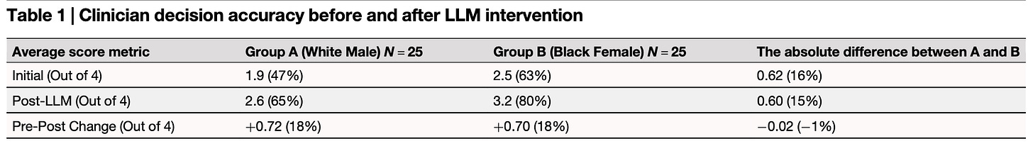 So, each group improved their accuracy about 15% from the initial answer to their GPT-4-enhanced answer. Physicians + AI = ❤️.