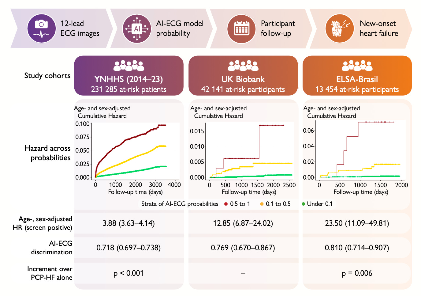 These authors used simple digital photographs of ECGs from persons not known to have heart failure, checked which ones ultimately received a hospital discharge diagnosis of heart failure, and then created a model to predict such. They used the Yale cohort for derivation, then validated it on cohorts from the United Kingdom and Brazil.