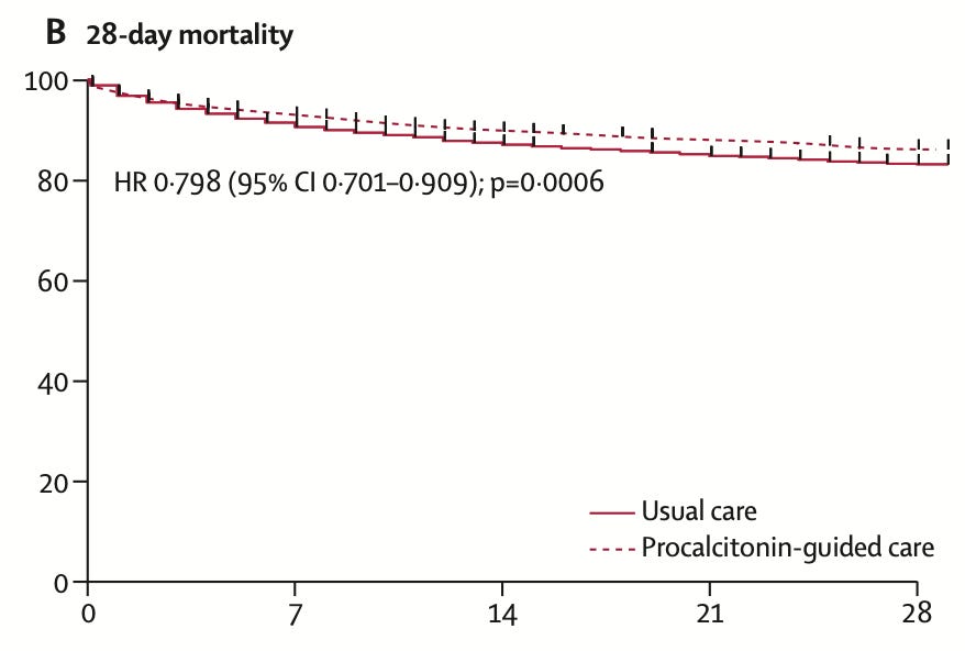 With 7,600 patients randomized, mortality was 13.6% in the procalcitonin-guided cohort and 16.6% with usual care.