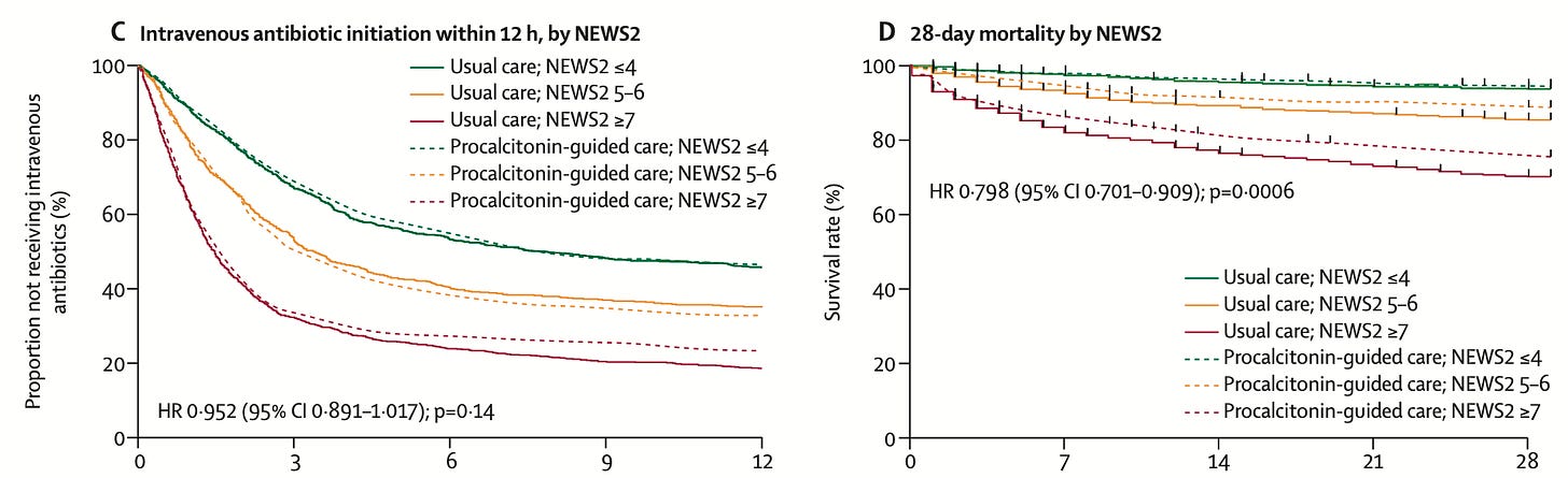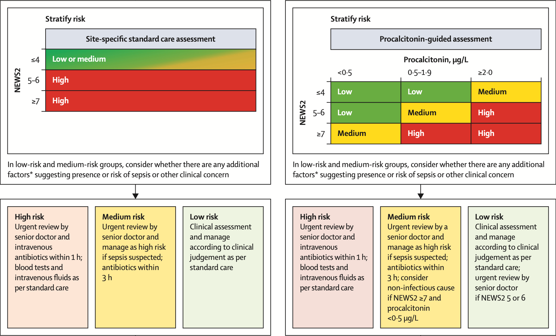 Patients either had “usual [emergency department] care” guided by standard, NEWS2-based sepsis protocols, or had combination NEWS2 + procalcitonin-guided assessment: