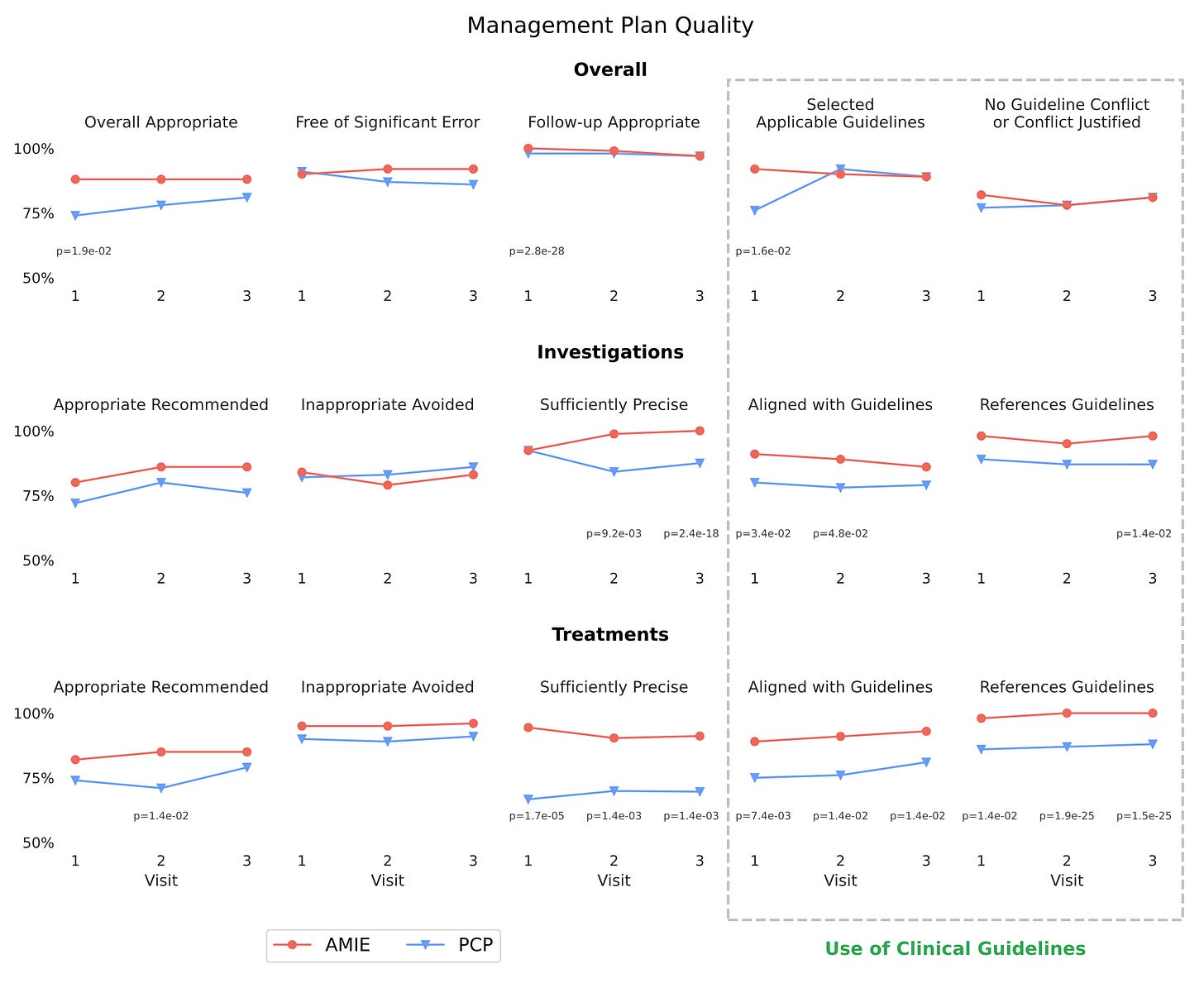 Performing a head-to-head trial with GPs, using simulated patient chat encounters over multiple virtual visits, agent performance compared favorably with humans: