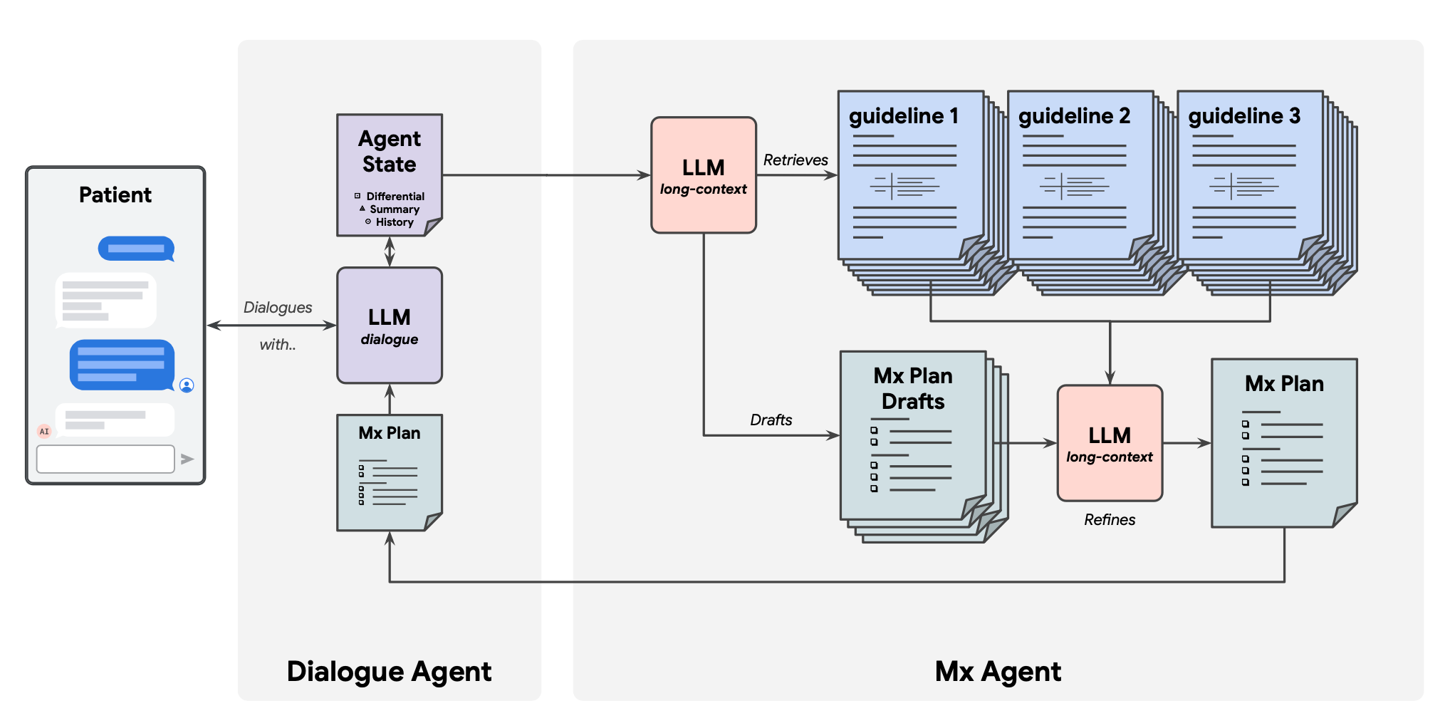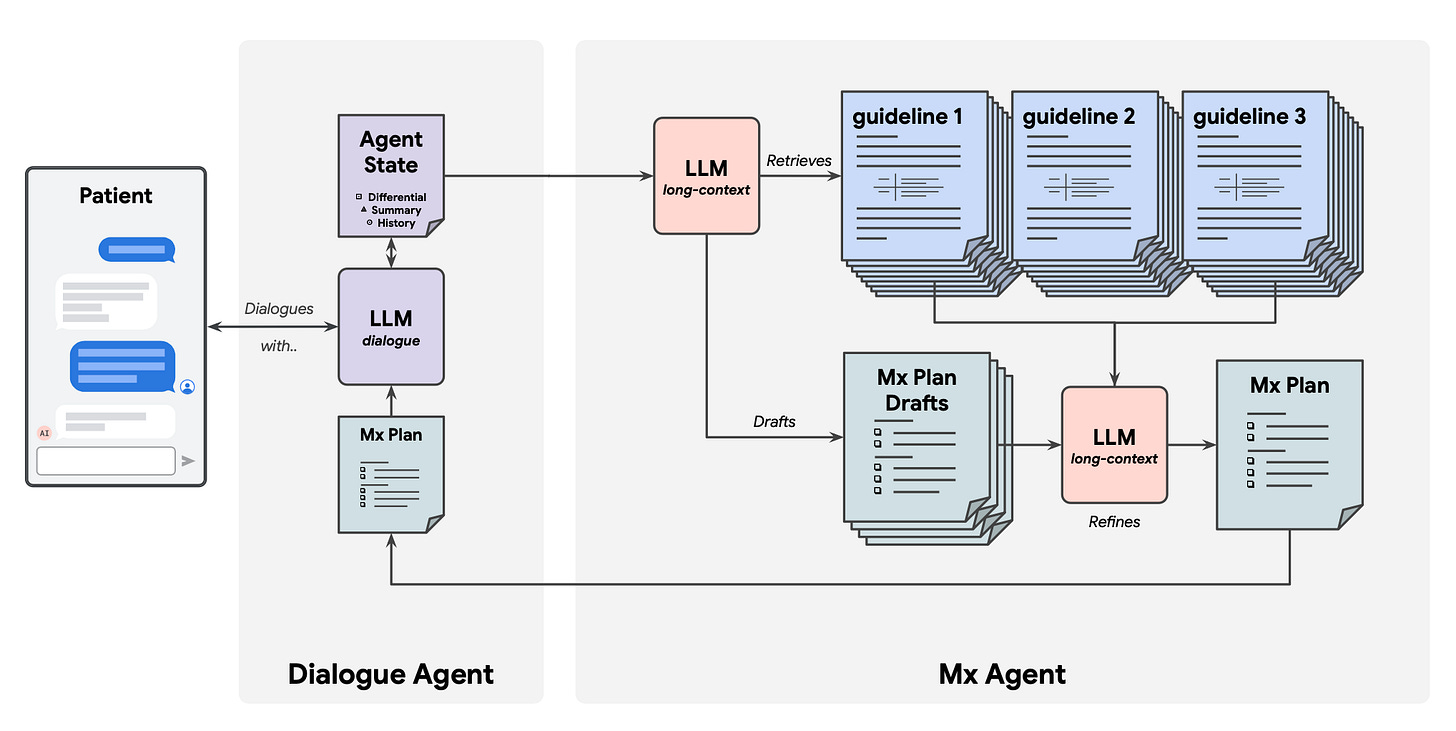 The state-of-the-art has moved forward, however, to agent techniques chaining together LLMs, each with specific roles within a problem context. In the Google demonstration, they use a "Dialogue Agent" with its own set of local memory and context to hold a responsive conversation with a patient. The conversational agent passes information gathered in conversation to an "Mx Agent", performing large-token size "reasoning" and tool access. The output from the "Mx Agent" flows back to the "Dialogue Agent" to guide the conversation.