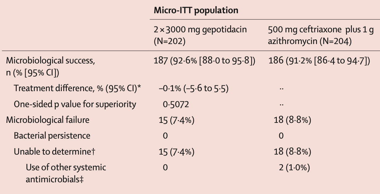 EAGLE-1 is the “new” publication this week, and this is the non-inferiority comparison against ceftriaxone plus azithromycin. Most of the N. gonorrhea isolates expressed some resistance to current antibiotic options. Their topline effectiveness results are here:
