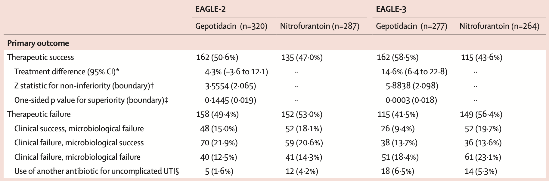And, then, EAGLE-2 and -3 are the trials evaluating its use for uncomplicated cystitis: