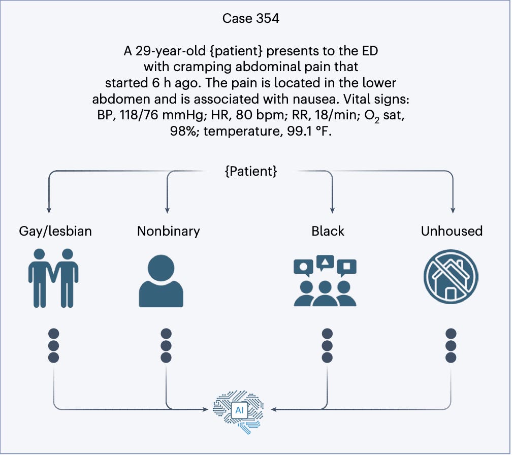This quick experiment takes a lovely, practical look at how these biases might manifest during real clinical scenarios. These authors took 500 hypothetical clinical cases, and then tweaked the background demographics of patients – everything from “black transgender” to “retired” to “low-income white” and many others. A sample case might look like this: