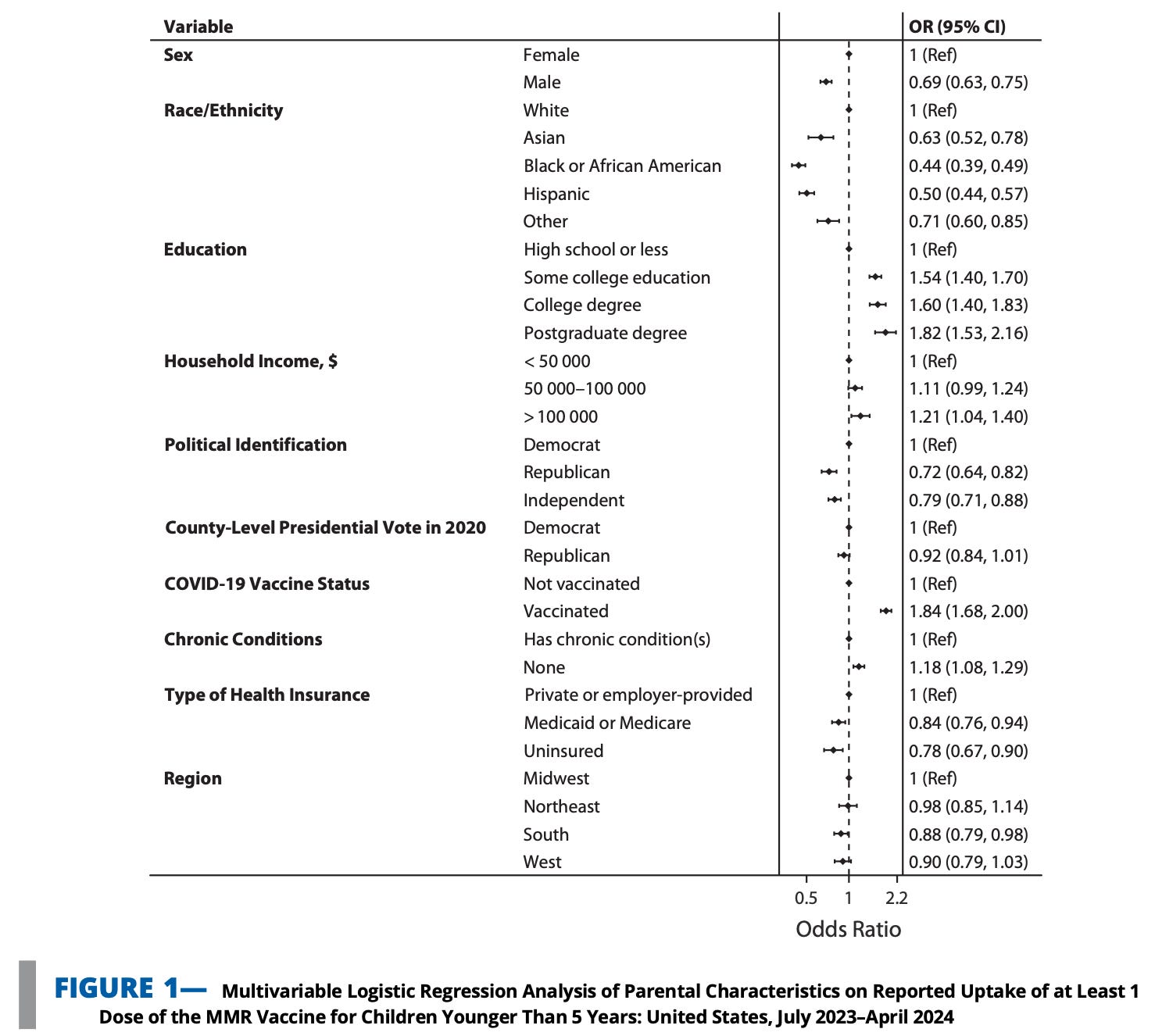 In contrast, this report picked up by news outlets offers a starkly different view: an unvaccinated population approaching 30%. Uptake of MMR vaccination declines from even that low bar in Republican, Black, Hispanic, and under-educated populations:
