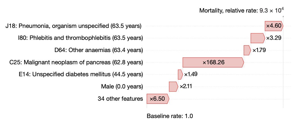 The reality is far more complicated, naturally, and the study itself is primarily of academic, not practical, interest. Effectively, the authors broke down patients in the UK biobank into medical event tokens. In language models, one token naturally follows another to create a sequence of words. In this instance, the medical event tokens beget future medical events, and thus disease progression. In some aspects, this works very sensibly. For example, illustrated by inspection of this breakdown of the strongest features associated with mortality in 63.5 year olds – a progression of tokens dominated by pancreatic cancer and its subsequent complications: