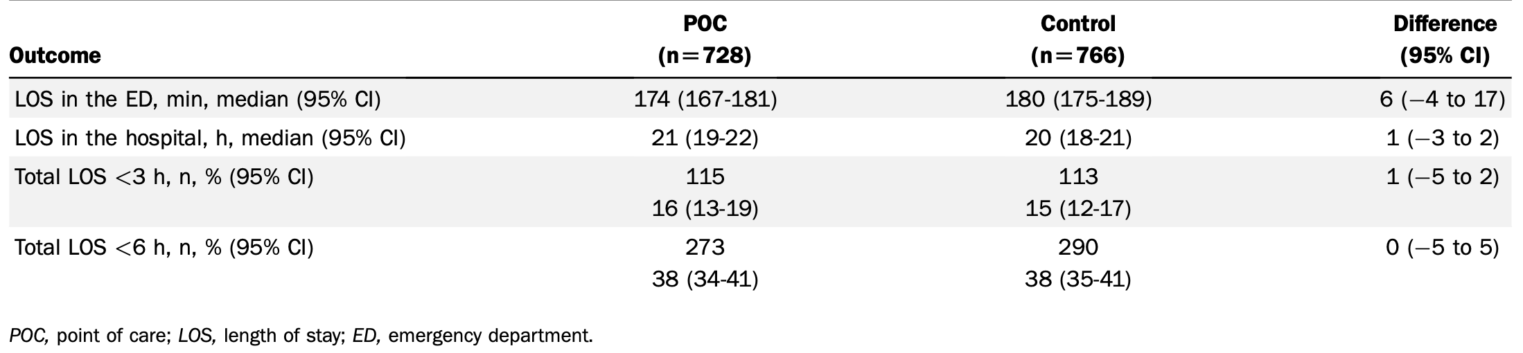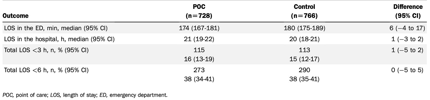 Troponin results were available 30 minutes faster in the point-of-care arm, but LOS was improved by 6 minutes, and proportions with early discharge were unchanged. This is, in part, due to problematic study design and inefficient surrounding processes. We in Christchurch have been using POC troponin for quite some time, and before-and-after observations show improvements in time-to-disposition.