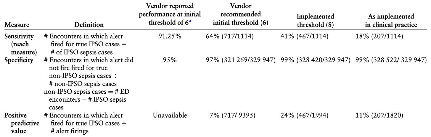Specifically, these authors are highlighting their experience with the Epic Systems pediatric sepsis module, based off a model derived from a data set of encounters from Nationwide Children’s Hospital. The derivation promised a certain level of performance – and that was not met. As seen in the table below, the authors tested model performance at the vendor-recommended sepsis risk score threshold, a higher score threshold, and then further tweaked the threshold to focus primarily on picking up hypothermic young children: