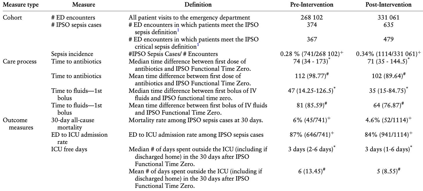 As you can see, there are – effectively – trivial differences of a few minutes for antibiotic and fluid administration. There are small differences in patient-oriented outcomes, but those all shake out from the increased rate of identification of “sepsis”, roping in an excess of non-critical sepsis cases. This is very typical of these sorts of EHR interventions demonstrating “improved outcomes” based on extra, mild, “sepsis” cases flowing from the circular intention-to-treat study definitions of sepsis.