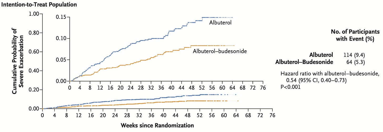 But, there were fewer “severe” exacerbations and a reduced per-participant exposure to systemic corticosteroids. The “number needed to treat” is relatively high, but the SABA+inhaled corticosteroid probably still wins the economic game preventing lost days of work and recovery. And, finally, it just makes sense – SABAs are a one-trick pony that don’t address the underlying inflammatory state triggering the bronchospasm.