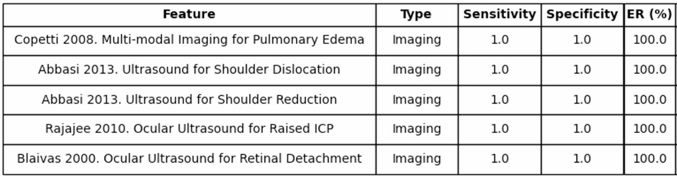 Obviously, to most emergency clinicians, this doesn’t have any face validity as to being a Top Five – the candidate features are obviously limited by the tests and studies included in their reviews – but it does give you an idea the sorts of things that substantially move the needle with good sensitivity and specificity: advanced imaging.